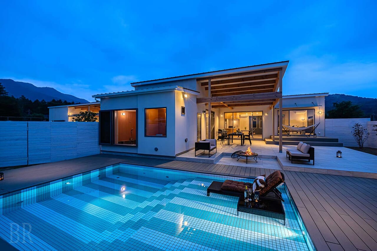 グランピングエリアの隣に佇む、客室温泉・サウナ、プライベートプール付きのリゾートヴィラ「KANOA THE VILLAS~富士山中湖~」。